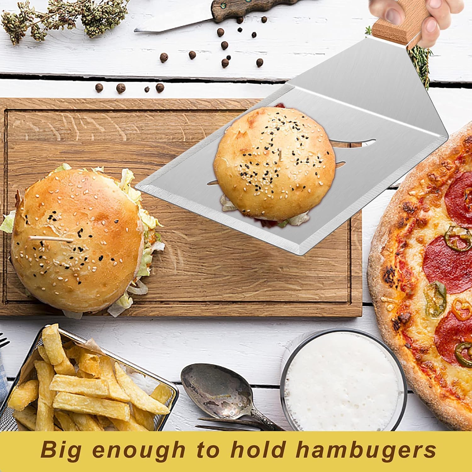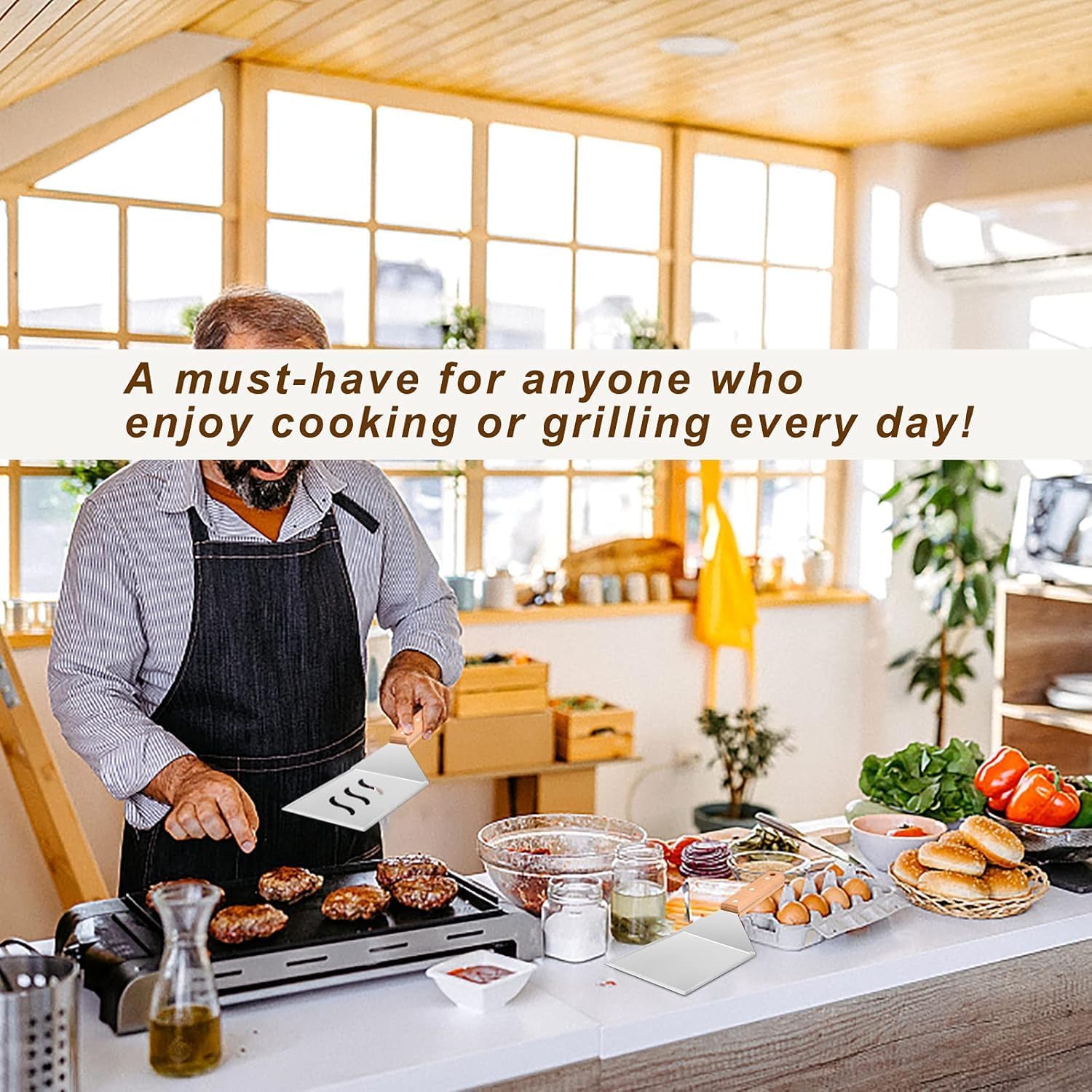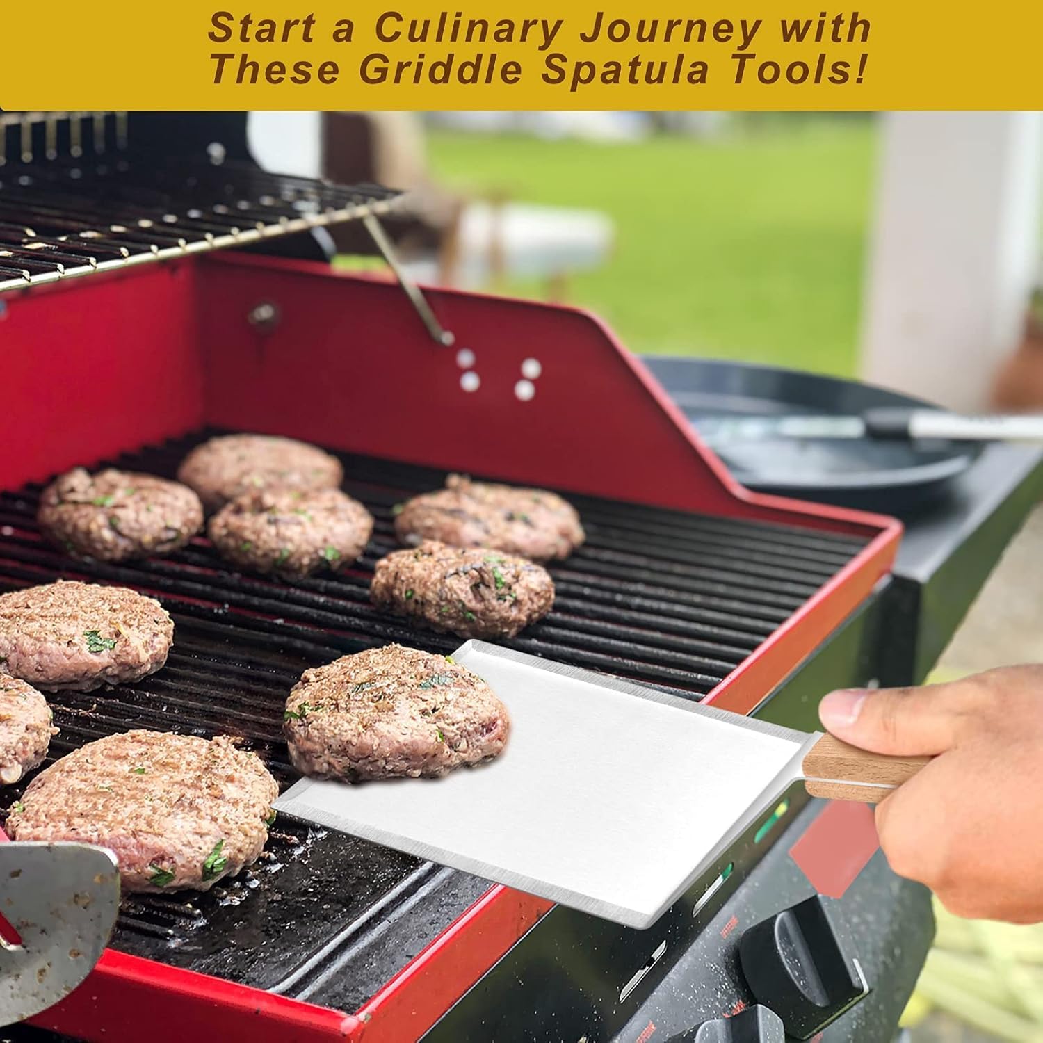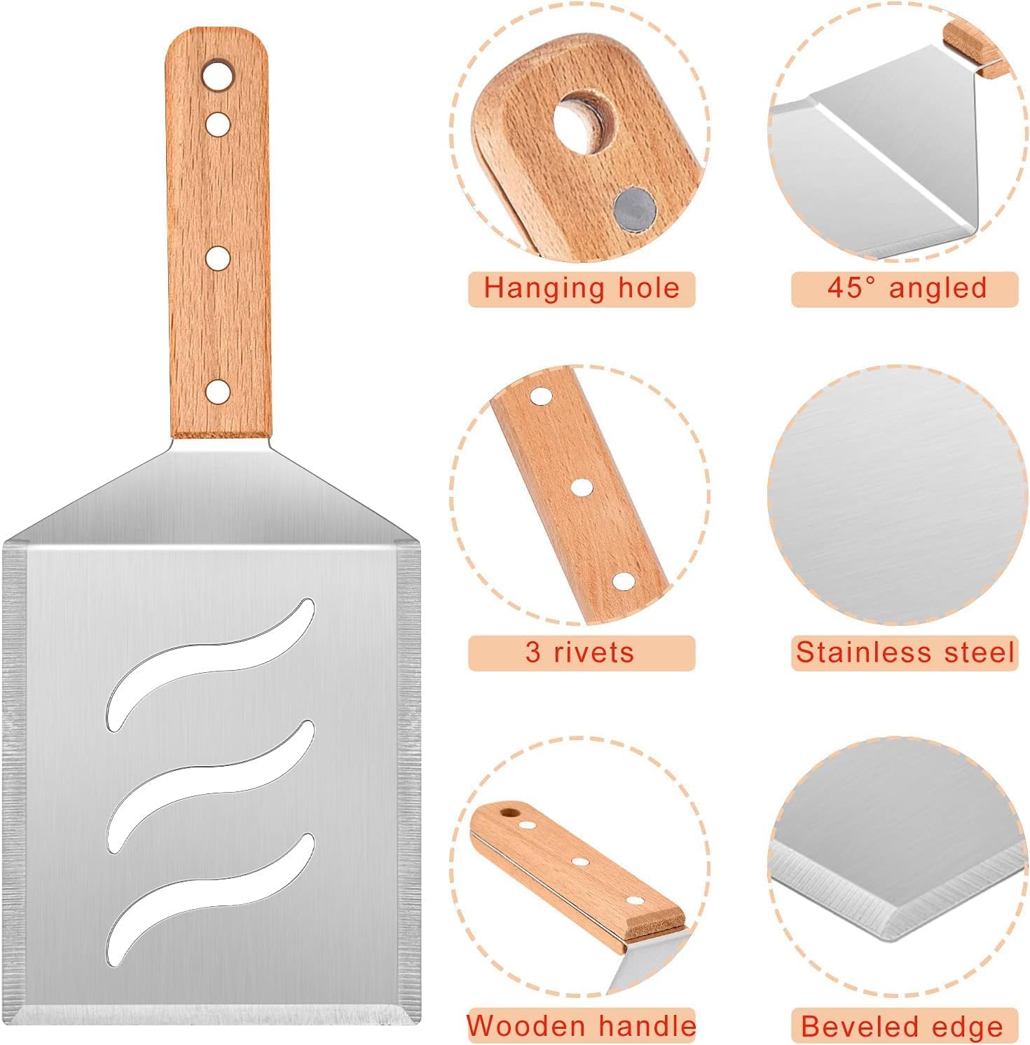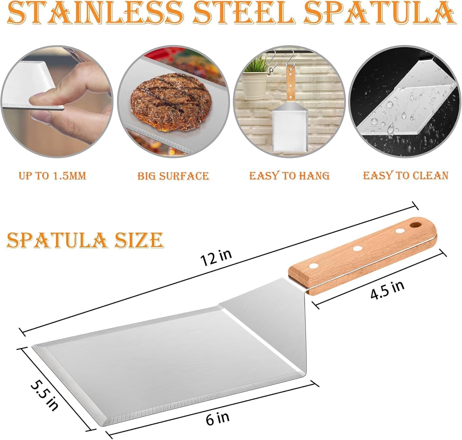 • MULTI-FUNCTIONAL – Basically meet your different cooking needs, Suitable for all griddles like cast iron, teppanyaki, hibachi, gas or propane, Perfect for smash burgers, pancakes, ribs, grilled pizzas, sandwiches, steaks, meatloaf and more, Plus 2 hooks for easy hanging